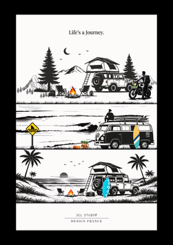 Le voyage ne se mesure pas en kilomètres, mais en moments. Un départ à l’aube, une route encore vide, le bruit du moteur, l’air salé, et cette sensation étrange d’être exactement là où il faut. Chaque visuel capture un instant. Un arrêt face à l’océan. Une session improvisée. Un feu de camp qui prolonge la journée. Les coordonnées ne sont pas là pour guider, mais pour ancrer un souvenir. Un lieu précis, pour une émotion unique. Ici, tout est simple. Des lignes épurées, des scènes essentielles, et beaucoup d’espace pour laisser respirer l’imaginaire. Parce qu’au fond, il ne s’agit pas seulement de surf ou de voyage. Il s’agit de ce moment où l’on s’arrête… et où l’on réalise que la vie elle-même est le voyage.